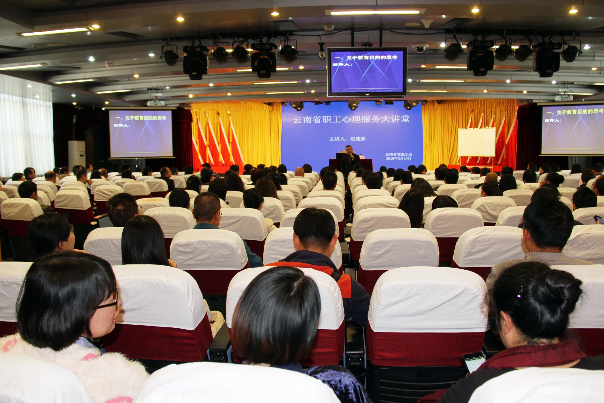 2月14日,省交通工会邀请到云南省心理学会副会长、著名心理学专家、云南师范大学教授赵建新到厅机关为广大干部职工举办题为《做个从容而成功的父母》的知识讲座,来自昆区厅属单位和厅机关干部职工约180余人参加聆听。