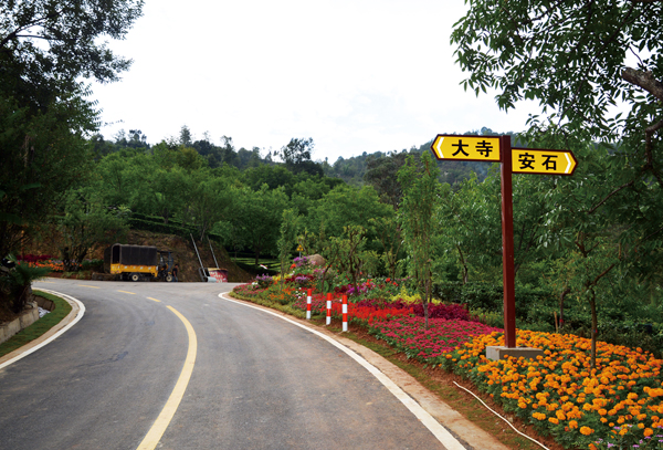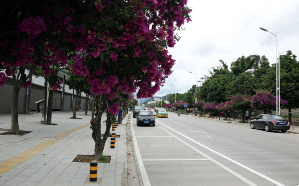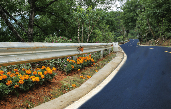 坚持“安全至上、崇尚自然、显山露水、彰显人文、路景融合”原则,在充分发挥公路沿线原有树木、花卉等植被绿化美化作用的基础上,按照“四季常绿”、“四季见花”、“四季有景”的要求,采取“前花后树、上乔中灌下草”模式因地制宜选择三角梅、春櫆、樱桃花、开花类乔木等绿化树种对公路两侧进行美化彩化,做到一路一树、一路一景。