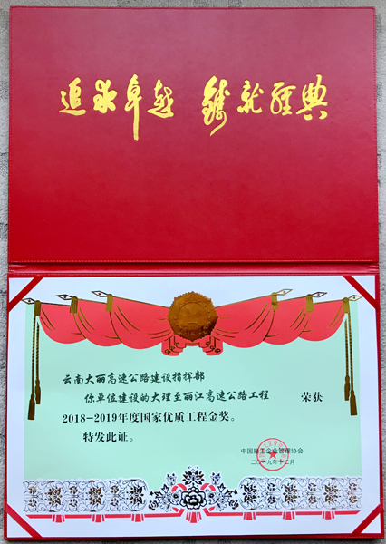 至此,大丽高速公路已获得省部级以上各类奖项共计42项,包括刚刚荣获的“国家优质工程金奖”,此前荣获的全国“公路水运平安工程”“水土保持生态文明工程”“第十五届詹天佑奖”“2016-2017年度李春奖”“云南省优质工程奖”,国家优秀勘察、设计奖4项,国家专利17项,国家和省级QC成果奖15项,两项科研课题获云南省科技进步一等奖、三等奖和中国公路学会科学技术二等奖。