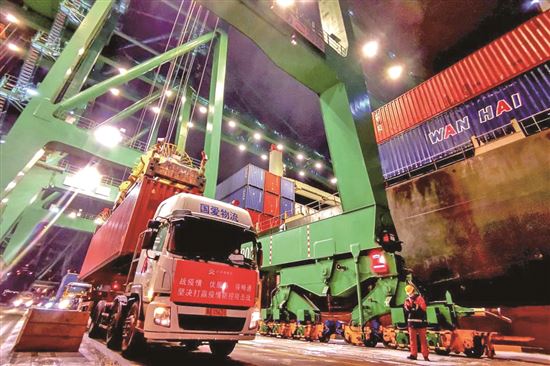 天津港集团开通“绿色窗口、绿色闸口、绿色通道”,快速接卸发运疫情防控物资。 何明波 摄