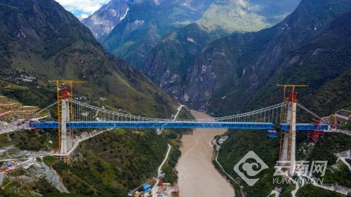 10月13日11时18分,随着最后一段重达640吨的钢桁梁被精准吊装到位,由中铁二院勘察设计、中铁大桥局施工的丽香铁路金沙江大桥钢梁成功合龙,标志着世界首座大跨度铁路专用悬索桥主体工程全面完成,为大桥如期通车打下了坚实基础。