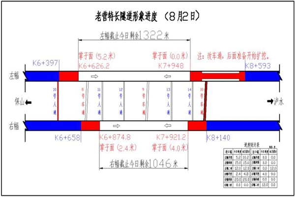 截至8月2日,已经施工5年多的老营隧道左幅掘进还剩1322米、右幅掘进还剩余1046米。