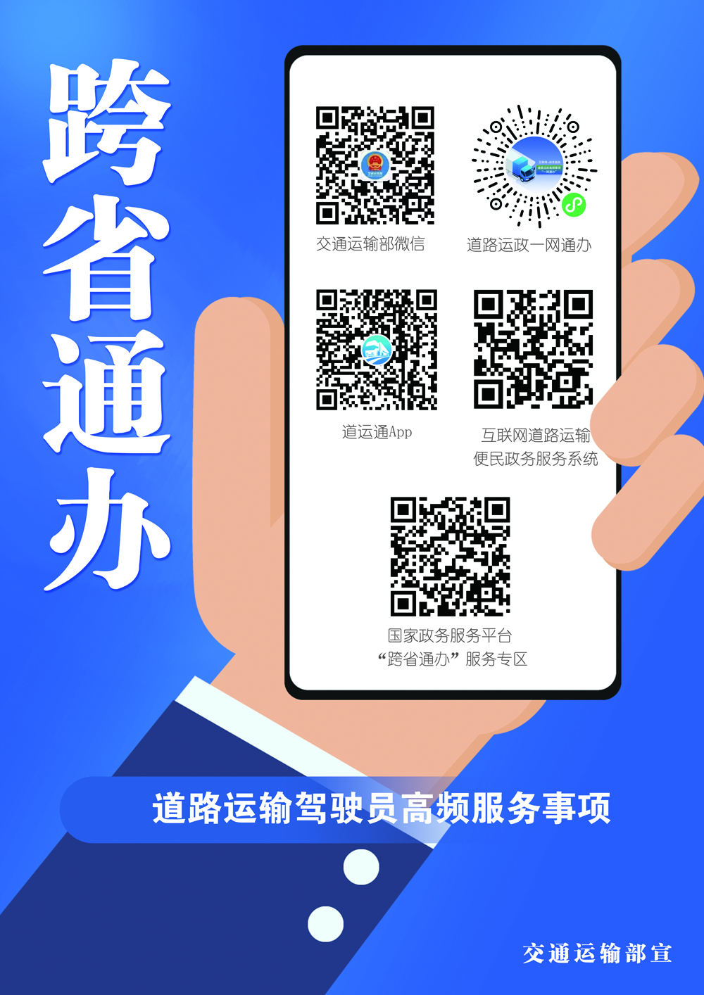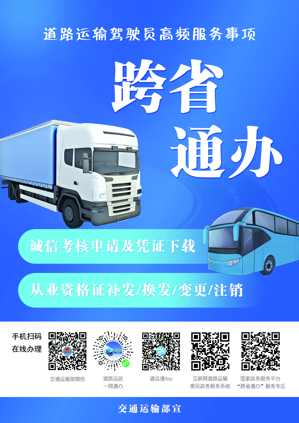 道路运输驾驶员高频服务事项“跨省通办”是一项让数据多跑腿,群众少跑腿的便民、利民、惠民的好政策。道路运输驾驶员可以通过交通运输部公众号、“道路运政一网通办”小程序和“运政通”手机APP、互联网道路运输便民政务服务系统、国家政务服务平台“跨省通办”服务专区等渠道在线办理。