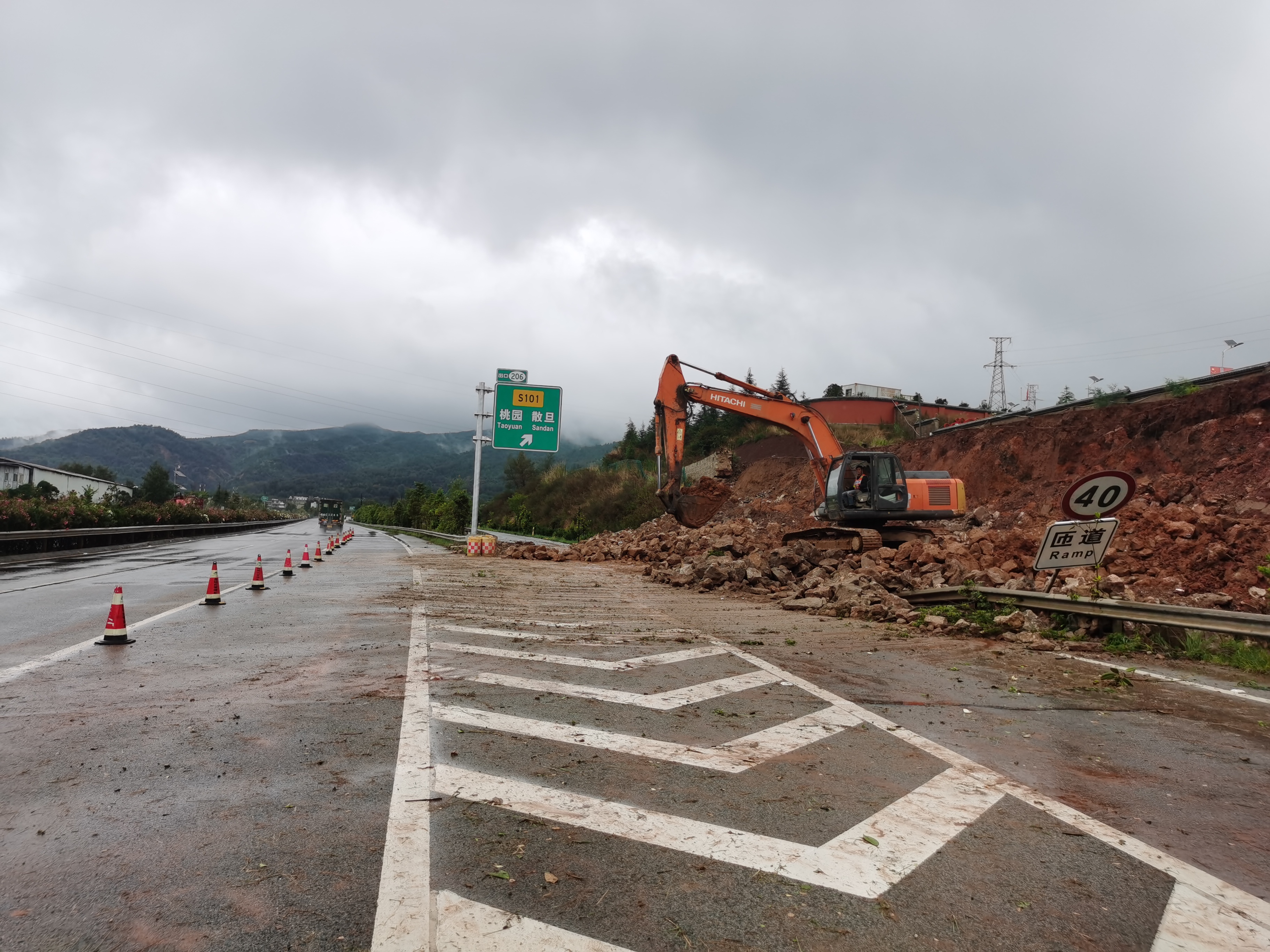 6月7日凌晨,武易高速下行前营收费站匝道内突发险情,大量泥沙被暴雨冲至高速公路路面,水毁面积约210立方米。