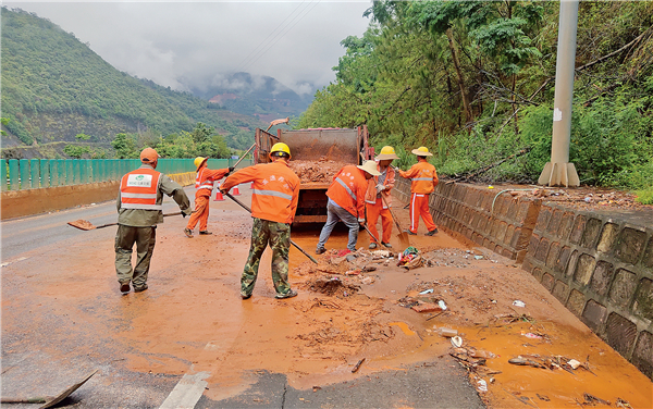 公路建设五公司昆明养护项目部及时组织应急抢险队伍,连夜清理出一条车道让车辆正常通行,清理完的同时对该处水毁位置用吨袋进行封堵,防止二次暴雨造成泥沙冲至路面。