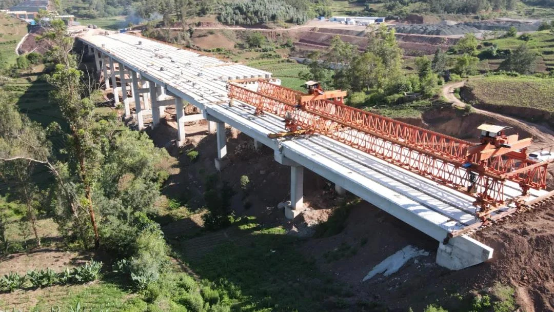 楚大高速公路扩容工程瓦苴里2号大桥左幅T梁吊装完成