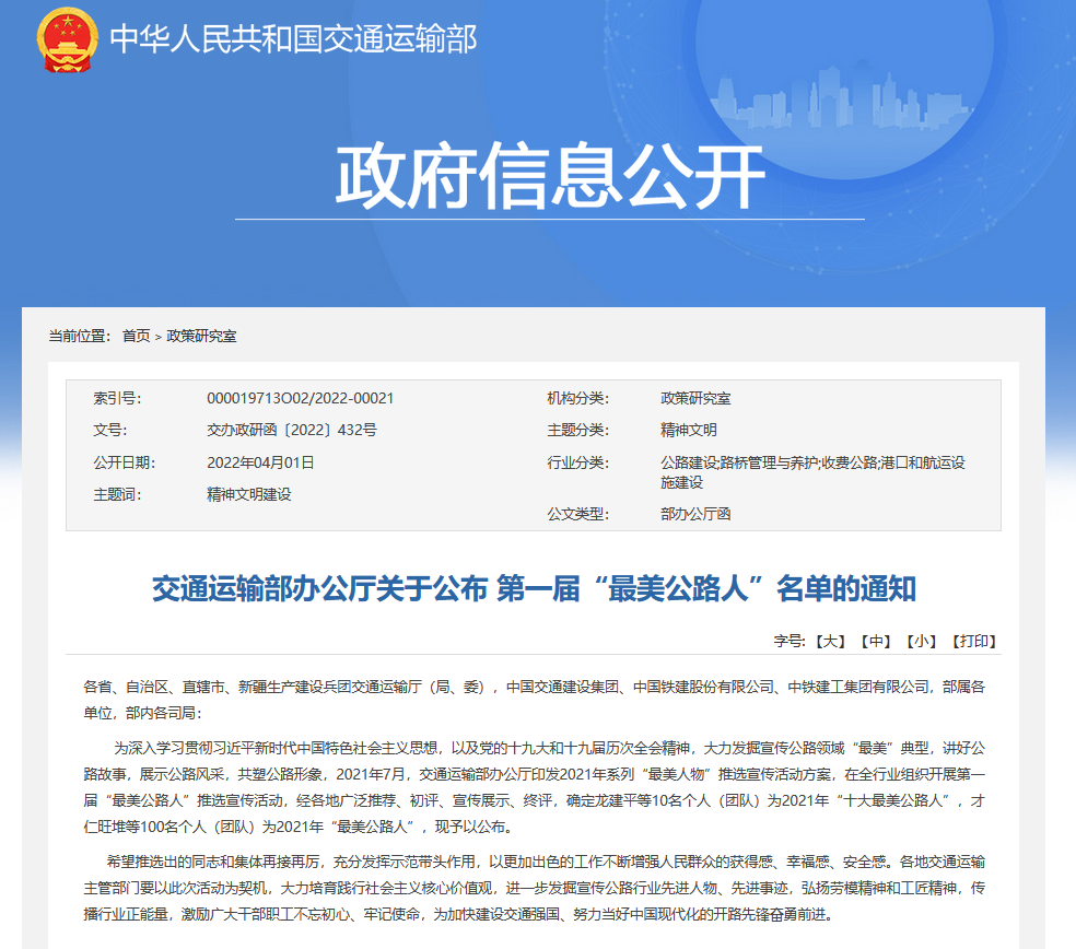 为深入学习贯彻习近平新时代中国特色社会主义思想,以及党的十九大和十九届历次全会精神,大力发掘宣传公路领域“最美”典型,讲好公路故事,展示公路风采,共塑公路形象,2021年7月,交通运输部办公厅印发2021年系列“最美人物”推选宣传活动方案,在全行业组织开展第一届“最美公路人”推选宣传活动,经各地广泛推荐、初评、宣传展示、终评,确定龙建平等10名个人(团队)为2021年“十大最美公路人”,才仁旺堆等100名个人(团队)为2021年“最美公路人”,现予以公布。