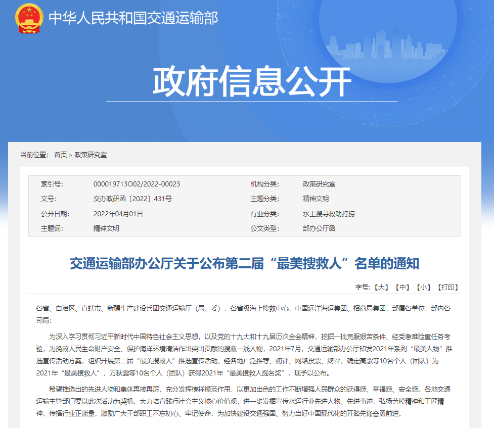 除了上述第一届“最美公路人”名单,交通运输部办公厅日前还公布了第二届“最美搜救人”名单,名单显示大理洱海搜救中心入选2021年“最美搜救人提名奖”名单。