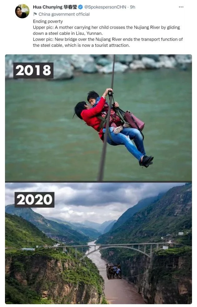 其中,在第十组对比照片中,华春莹的关键词是“消除贫困”。她写道:“2018年,云南傈僳族自治州,一位母亲抱着孩子通过溜索横渡怒江;2020年,怒江上方架起大桥,昔日的溜索已成为游客体验景点。”