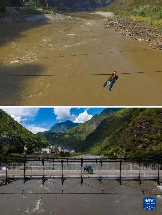 这是一张拼版照片:上图为一名男子带着自行车在怒江州泸水市六库街道双米地村辣子咪村民小组溜索过怒江。下图为2022年9月14日,居民在六库街道桥上散步休闲。新华社记者 蔺以光 岑云鹏 摄