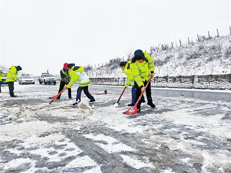 “别担心别着急,我们帮你推车。”“待会儿前方会有铲雪车,我们会在前方带路,你们放缓速度跟好前车。”在曲陆、普宣、沾会、待功、昭会等路段,工作人员们一边用融雪剂处理积雪,一边帮助没有雪天行驶经验的打滑车辆撤离。一个个昼夜坚守的工作人员在冰天雪地里忙着推车、除雪、保通、疏导,战冰斗雪。