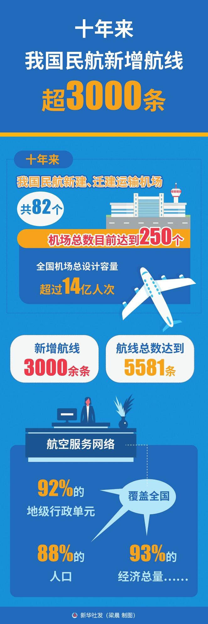 这十年,铁路、公路增加里程约110万公里;全国内河航道通航里程12.8万公里,拥有生产用码头泊位20867个;新建、迁建运输机场82个,机场总数达到250个;拥有邮政快递营业网点41.3万处……