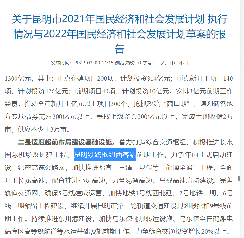日前,《关于昆明市2021年国民经济和社会发展计划执行情况与2022年国民经济和社会发展计划草案的报告》报告明确,昆明市2022年着力打造综合交通枢纽积极推进,长水国际机场改扩建工程、昆明铁路枢纽西客站前期工作力争年内正式启动建设。