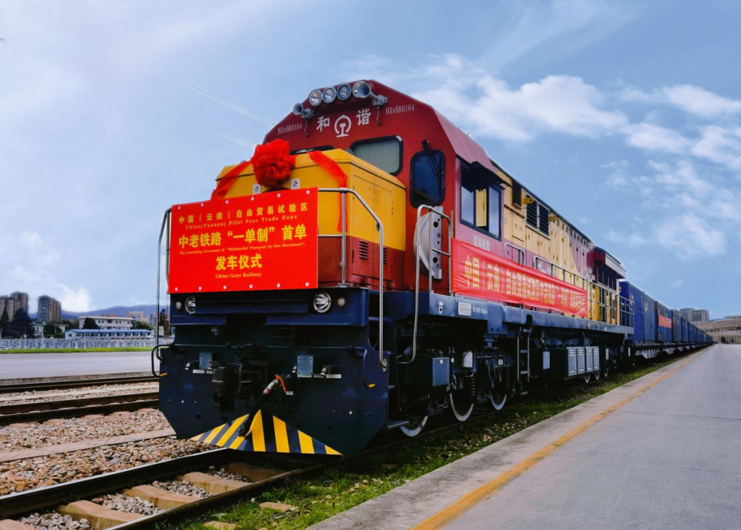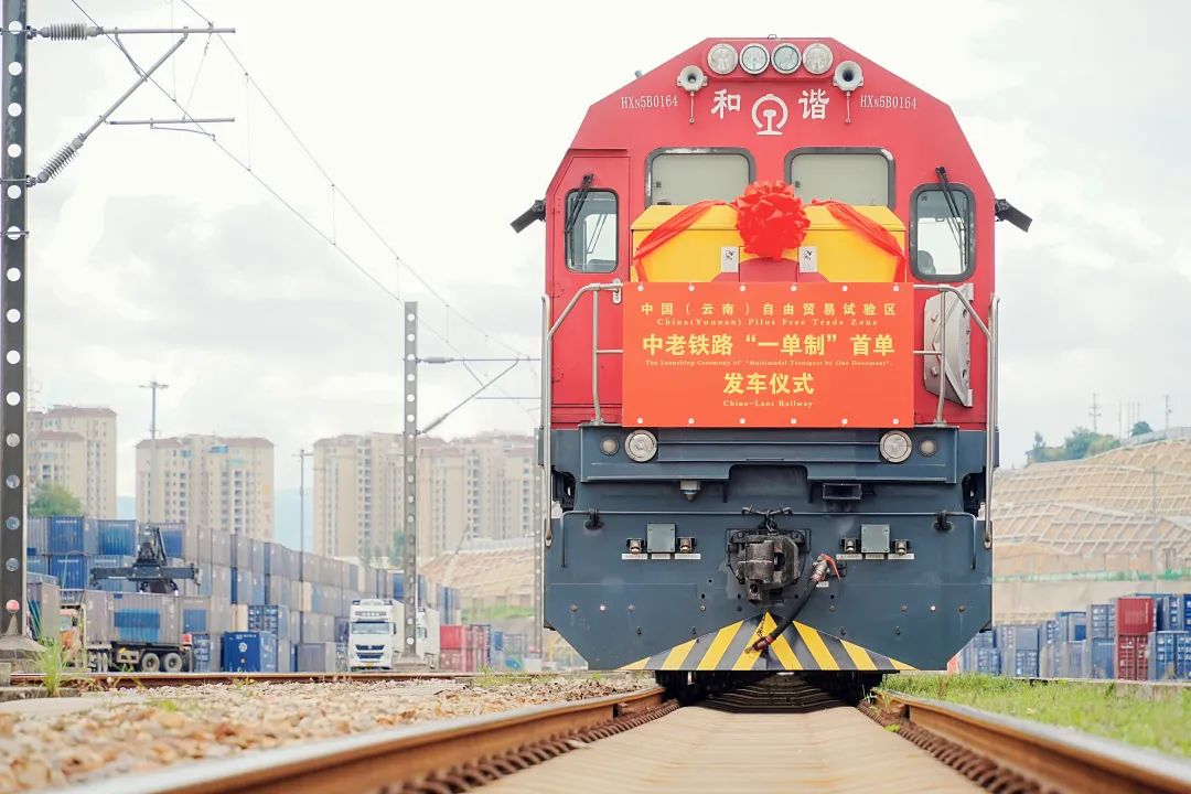 8月30日上午11时,中国(云南)自由贸易试验区中老铁路“一单制”首单发车仪式在中铁联集昆明中心站举行,共计23车46箱满载1200余吨货值120余万美元,(折合人民币860余万元)货物的列车从王家营西站缓缓驶出,该趟列车同时也是云投集团旗下省国际班列组织发运的第1000列中老铁路跨境货物列车。