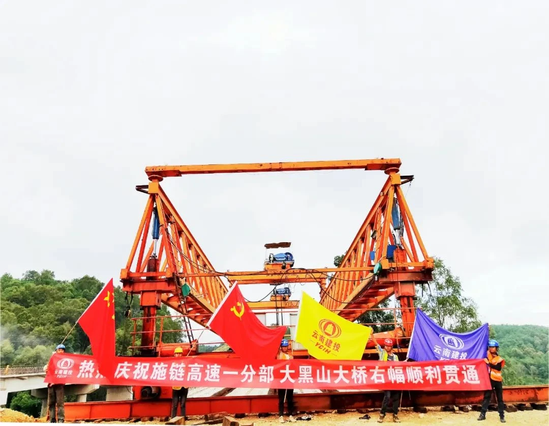 施勐高速公路大黑山大桥完成全部T梁架设,实现双幅贯通。大黑山大桥位于施甸县甸阳镇,为上跨地方路、冲沟而设,右幅全长333.58米,左幅全长216.08米(于9月6日贯通),为先简支后结构连续,全桥双幅共5联 ,共设7道伸缩缝,共架设30米T梁90片。