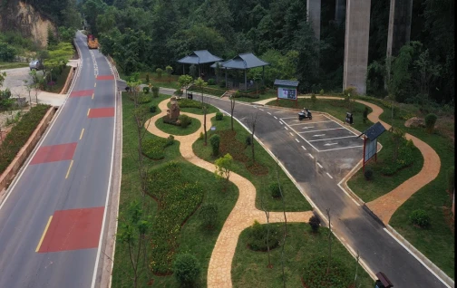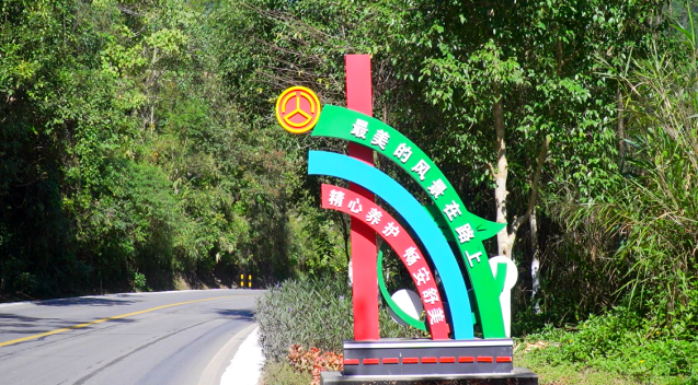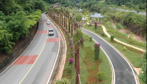 围绕“绿美公路”设施美、绿化美、路域美的“三美”创建目标,突出地域特点,将自然景观、人文景观有机结合,工程于2022年3月14日开工建设,9月初全面完工。共计栽种凤凰树、黄花风铃木等乔木110棵、一品红11120株,木春菊等地被3080平方米;铺筑微表处22万平方米(22公里)、彩色路面铺筑3950平方米,新划标线11300平方米,修筑花池430平方米,设置观景台2个9954平方米。