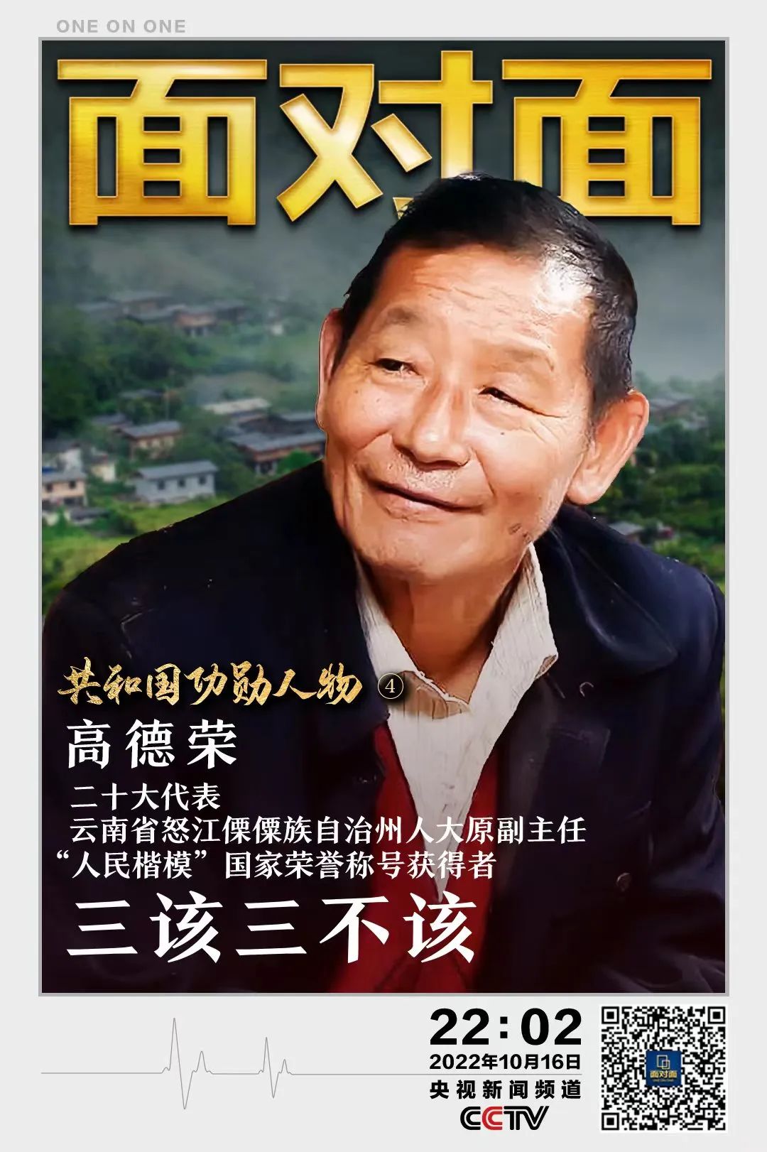 10月16日,央视《面对面》共和国功勋人物专访党的二十大代表:云南省怒江傈僳族自治州人大原副主任,“人民楷模”国家荣誉称号获得者高德荣。