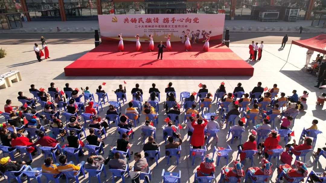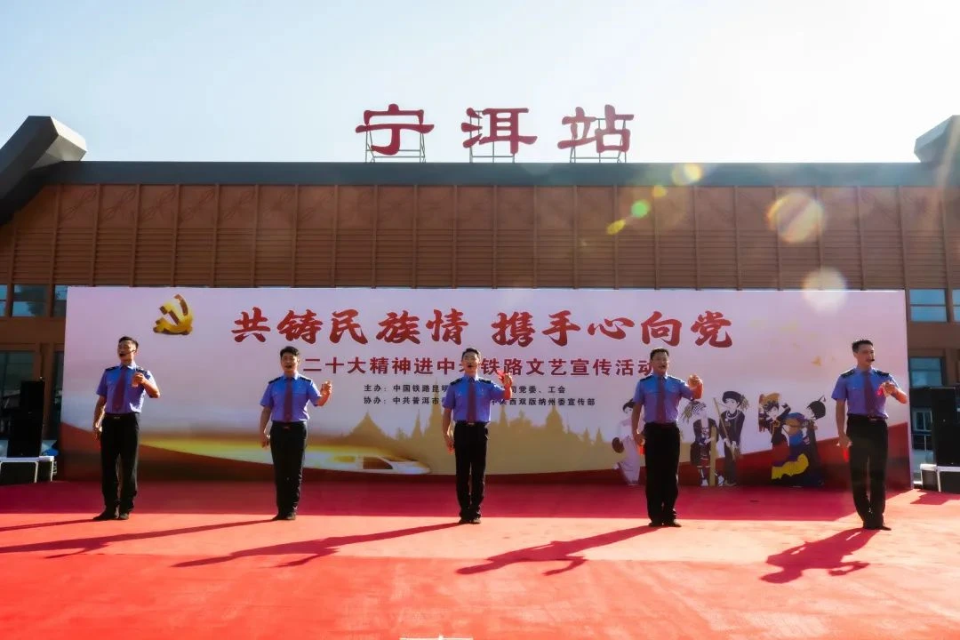 为学习宣传贯彻党的二十大精神,展示中老铁路良好形象,深化铁路职工广泛交往、全面交流、深度交融,全力打造中老铁路民族团结示范站、示范线,中国铁路昆明局集团有限公司党委、工会主办,西双版纳州州委宣传部、普洱市委宣传部协办,在中老铁路西双版纳站、宁洱火车站,以及部分旅客列车上,组织开展“共铸民族情 携手心向党——党的二十大精神进中老铁路 ”文艺宣传活动。