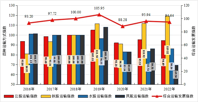 2022年综合运输各运输方式发展情况略有差别,公路运输指数为94.49点,受客运低迷影响,同比降低1.09%;铁路运输指数为119.32点,同比增长6.61%;水路运输指数为86.16点,同比增长3.17%;民航运输指数为69.50点,同比降低19.48%。