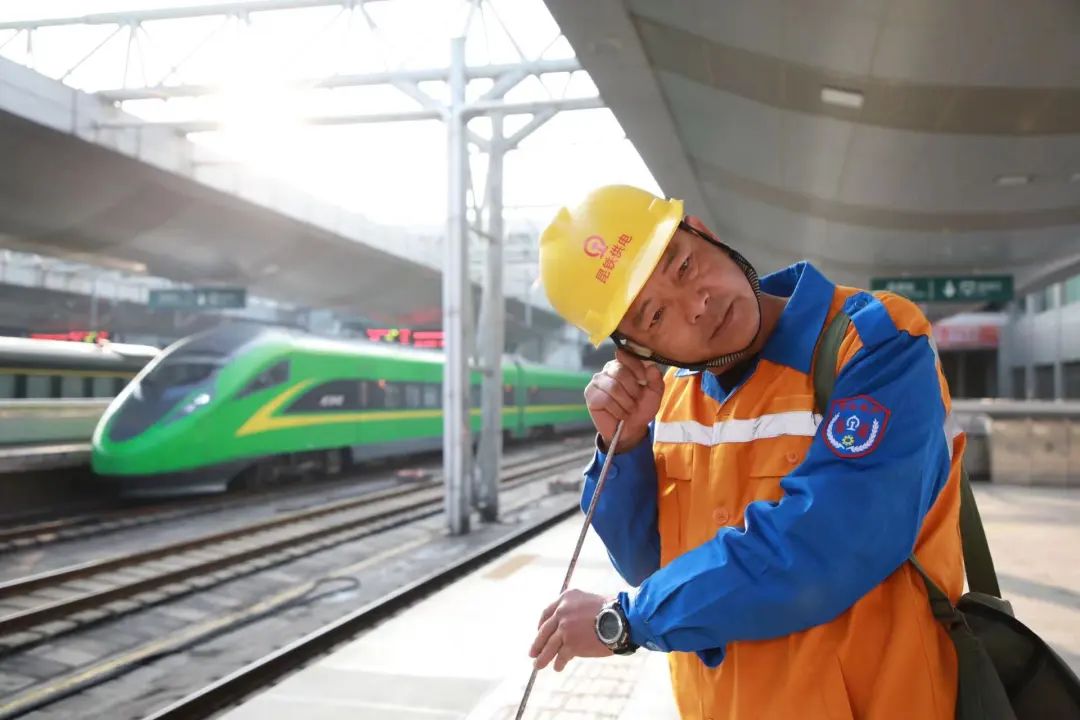 入夜,两名身穿亮黄色工作服、手拿细长金属棒的铁路职工一前一后,沿着中老铁路玉溪站的轨道缓慢前行。每走几步,其中一个身材瘦高的身影便停下脚步,将金属棒一端竖在地面,另一端贴在耳旁,专注倾听来自地下的动静……