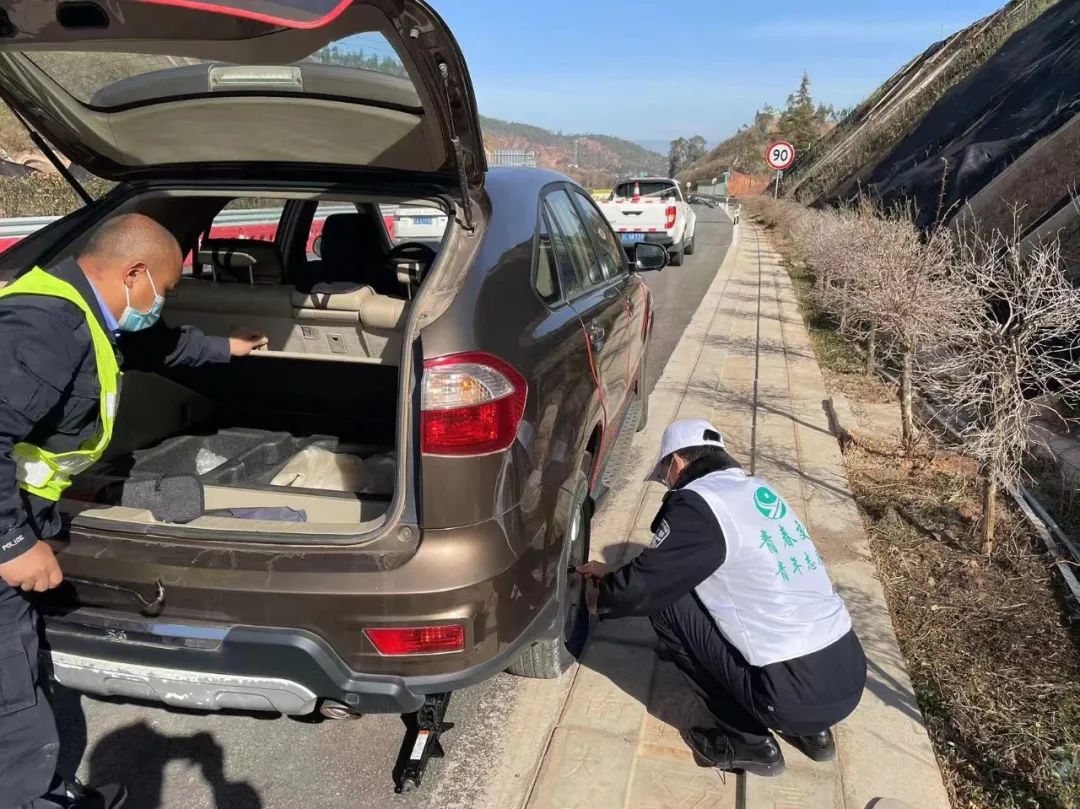 1月26日,大南高速短坝田隧管站路巡人员帮助故障车辆更换轮胎。