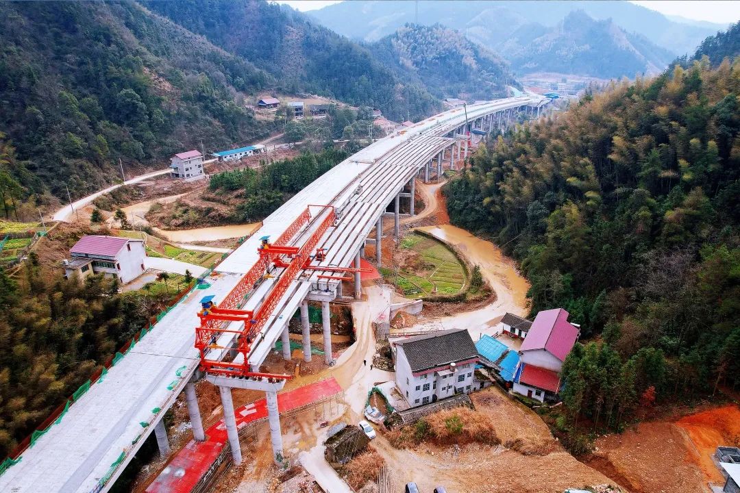 建设中的官新高速双桥村2号大桥。截至目前,项目路基工程完成99%,桥梁工程完成91%,隧道工程完成96.4%,计划2023年年底建成通车。