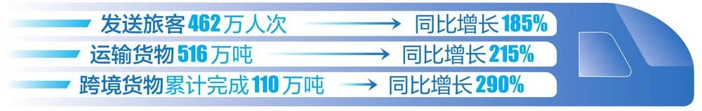 今年以来,中老铁路呈现客货两旺发展态势,一季度中老铁路累计发送旅客462万人次,同比增长185%,累计运输货物516万吨,同比增长215%,跨境货物累计完成110万吨,同比增长290%。