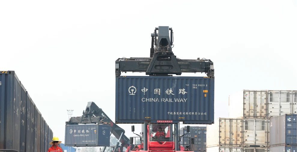 现场只见集装箱正面起重机将印有“中国铁路”字样的集装箱从标准轨列车上吊起,又稳稳地放置在米轨列车上,平稳有序地进行吊装作业。