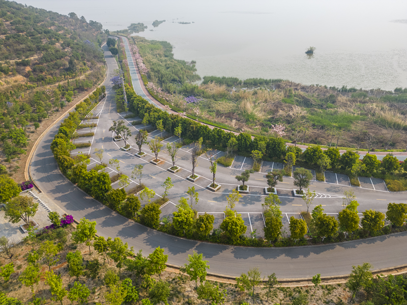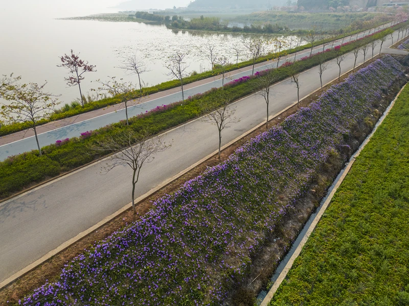 采取乔、灌、花、草相融合的模式实施绿化美化,沿线补种黄花风铃木、重阳木等乔木750株,三角梅、迎春柳等灌木9700株,常春藤等地被植物7000余平方米。设置休闲观景台 11 个。形成“四季常青、四季有花”的绿色廊道,构造出“人在车中坐,车在画中游”的公路自然景观。