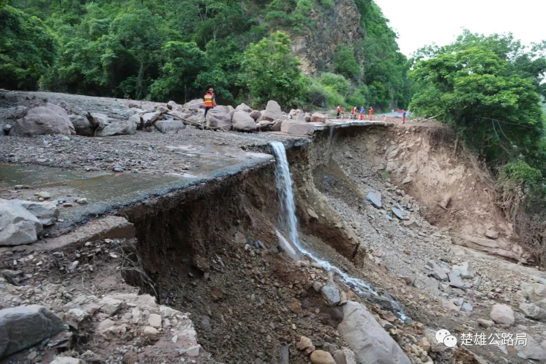 受持续强降雨影响,8月13日13时35分,楚雄公路局管养的G227线 K3005+140-K3005+220段因泥石流阻塞涵洞,导致路基被山洪冲刷损毁,形成了长80米,高15米,宽25米的路基塌陷缺口,造成交通中断。楚雄公路局立即启动应急预案,迅速组织应急抢险人员和机械苦战3天,于8月17日18时实现了便道通车。