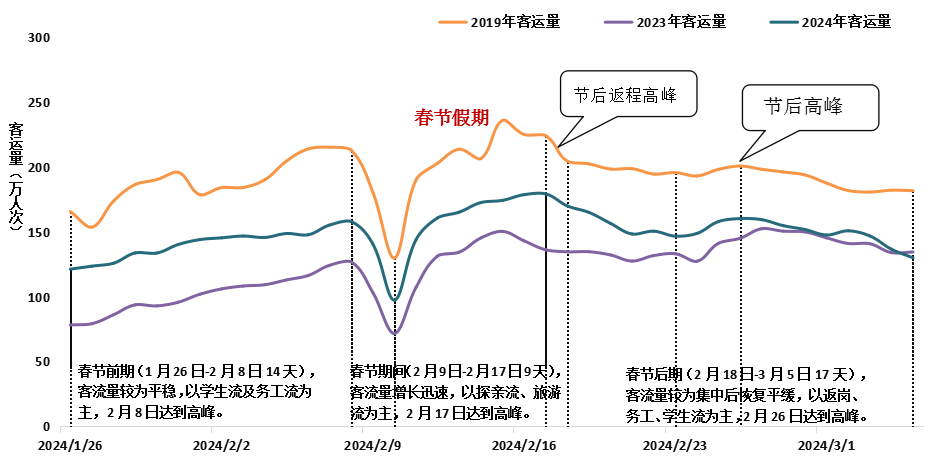 4.客流节前分散节后集中,三段式阶梯式波动上升。第一阶段呈现客流持续走高态势。节前客流分散,旅客错峰出行,2月8日出现群众返乡过年的客流高峰,客运量为157.96万人次。第二阶段呈现客流“一去两返”态势。自2月11日(正月初二)起,因探亲、访友、假日游玩等原因迎来出行高峰。2月16日(正月初七)至2月19日(正月初十)迎来返程返岗高峰,峰值出现在2月17日(正月初八),客运量达179.32万人次。第三阶段呈现客流先增后稳态势。公众集中返程流、返岗流、返校流叠加,节后高峰时段为2月25日(正月十六)至2月27日(正月十九),峰值出现在2月26日(正月十七),客运量160.28万人次。