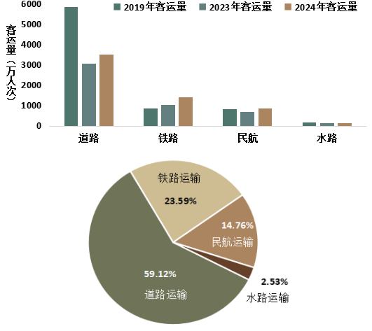图2:2019年、2023年、2024年四种运输方式客运量对比及占比图