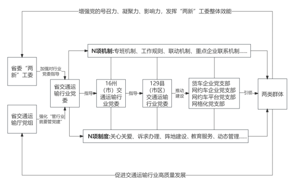 第二,构建协调联动机制,做好“同题共答”文章。一是上下联合找党员。通过省道路运输综合管理系统提取全省“两类群体”128万人信息,与省委组织部、省公安厅、省退役军人事务厅信息系统进行比对,初筛党员司机5.24万人。组织各级交通运输部门,与乡镇(街道)、村(社区)共同开展党员核实工作,历经2个月的排查,全省共摸排核实两类群体党员12592人。二是横向联手解难题。积极对接沟通,将省公安厅、省人力资源和社会保障厅、省邮政管理局等有关部门,纳入行业党委委员单位,形成工作合力。今年以来,会同省社保局研究解决了网约车司机劳动关系不顺、社会保障不足等棘手问题。三是内外联动促推进。与四川、江苏等全国试点省份交通运输厅保持常态化沟通,积极主动向交通运输部、省委社会工作部等有关部门汇报,争取对交通运输行业党建工作的指导和支持,有力推动工作落实。