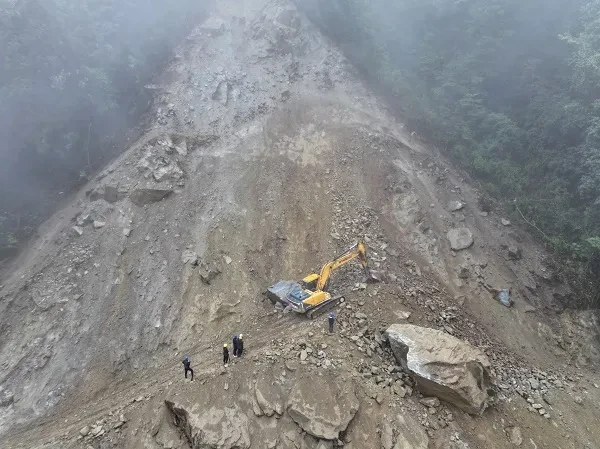 “因灾毁点上方山体存在大面积的石块堆积体滑层,加之不间断降雨,二次塌方频发,边下雨边塌方边排险作业,灾害现场情况复杂,险象迭生,抢险作业多次被迫中断,且当天清理过的路段第二天又要重新清理,推进困难。抢险过程中,安排专人使用无人机在灾害点全方位观察,实时监测险情,采用从上到下、两头并进的方式开展作业”,指挥部安全保通处尹东对灾害点抢通情况进行介绍。