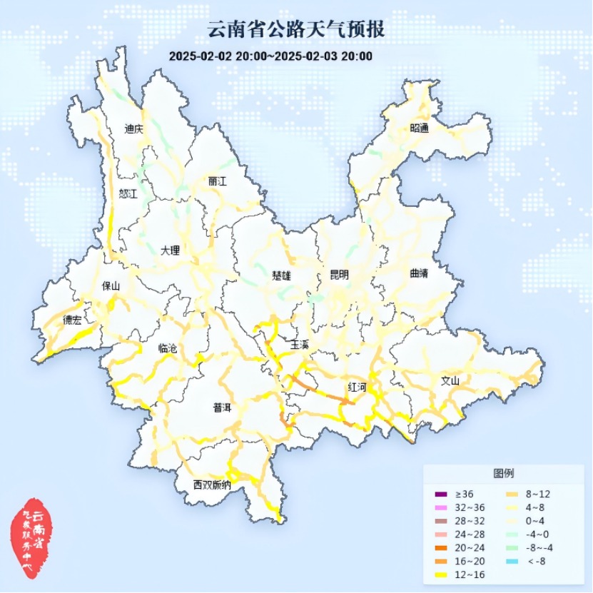 2月2日20时至3日20时最低气温0℃以下(道路结冰)影响的路段为:G214迪庆段、G0613迪庆段、G215维西段、G353维西段、G56楚雄段、G5621楚雄段、G56昆明段、G85昆明段、G7611昭通段等高海拔路段。