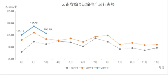 2025年3月云南省综合运输生产态势小幅回落,TDMI为106.99,环比减少7.71%,同比增加3.97%。春运客流高峰过后,群众出行需求减弱,综合客运生产回归运行常态;春耕季节对大宗物资和农产品的运输需求增加,各个产业领域生产有序地恢复,综合货运生产迅速回升,经济持续恢复向好的状态进一步显现。