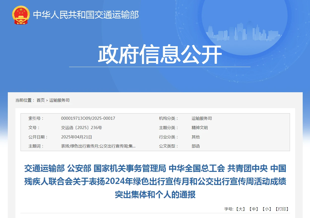 近日,交通运输部、公安部、国家机关事务管理局、中华全国总工会、共青团中央、中国残疾人联合会联合印发《关于表扬2024年绿色出行宣传月和公交出行宣传周活动成绩突出集体和个人的通报》(交运函〔2025〕236号),通报表扬在活动期间成绩突出的集体和个人。