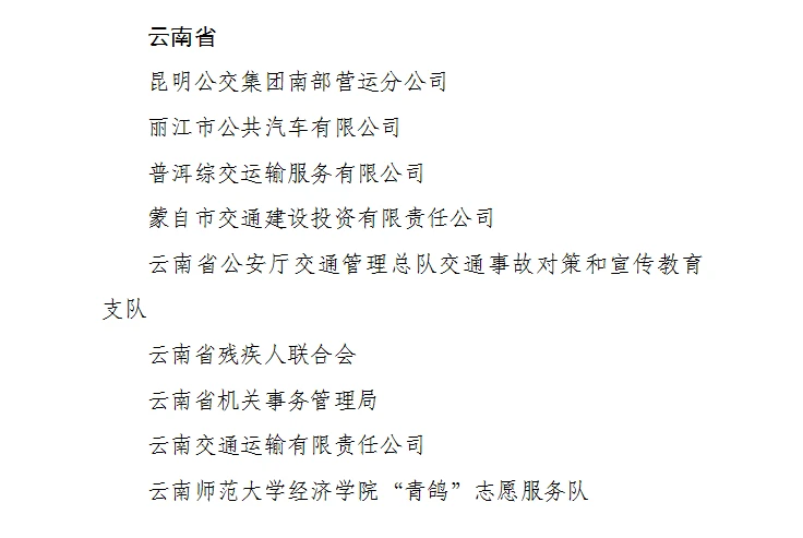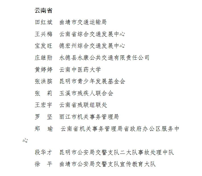 云南省9个集体和12名个人获得通报表扬。其中,交通运输行业的昆明公交集团南部营运分公司、丽江市公共汽车有限公司、普洱综交运输服务有限公司、蒙自市交通建设投资有限责任公司、云南交通运输有限责任公司5个单位获评“成绩突出集体”;田红斌、王兴梅、宝发旺、庄继勋4位同志荣获“成绩突出个人”荣誉称号。