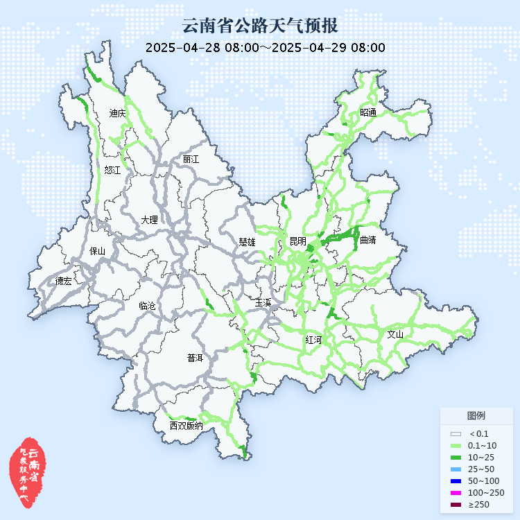 4月25日16时发布重要天气预报:受冷空气和西南暖湿气流共同影响,预计4月28日至5月1日,我省大部分地区将出现降雨降温天气。曲靖市、昆明市、文山州、红河州、玉溪市、楚雄州、丽江市东部、普洱市、西双版纳州、德宏州西部将出现中雨局部大雨、暴雨;4月28日至29日,中东部和南部最高气温将下降6~8℃,局部地区超过10℃;4月30日至5月1日,西部最高气温将下降4~6℃,局部地区超过8℃。过程期间,上述地区还将有雷暴、局部地区冰雹、大风及短时强降水等强对流天气。G248东川段、G246广南段、G323砚山-富宁段、G80砚山-富宁段、G359富宁段、G8511呈贡段、S27澄江段、G5601宜良-澄江段、G78宜良段、G326石林-弥勒段、G357弥勒-泸西段、G248泸西段、G8511普洱段、G227普洱段、G213勐腊段、G8511勐腊段等路段将自东向西先后受到较强降雨天气影响。请公众出行注意保暖和行车安全。