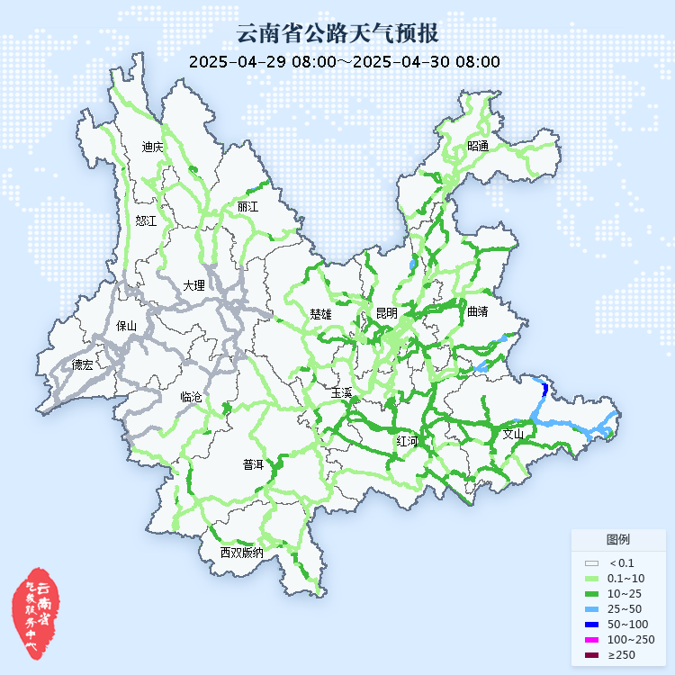 4月29日08时至30日08时受大雨及以上量级降水影响的路段为:G248东川段、G246广南段、G323砚山-富宁段、G80砚山-富宁段、G359富宁段。