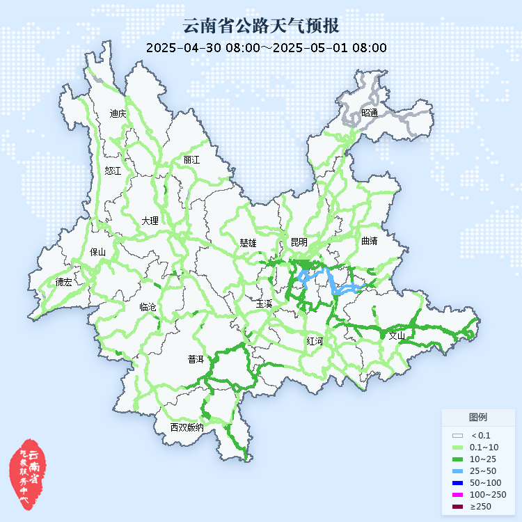 4月30日08时至5月1日08时受大雨影响的路段为:G8511呈贡段、S27澄江段、G5601宜良-澄江段、G78宜良段、G326石林-弥勒段、G357弥勒-泸西段、G248泸西段。