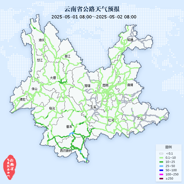 5月1日08时至2日08时受大雨影响的路段为:G8511普洱段、G227普洱段、G213勐腊段、G8511勐腊段。