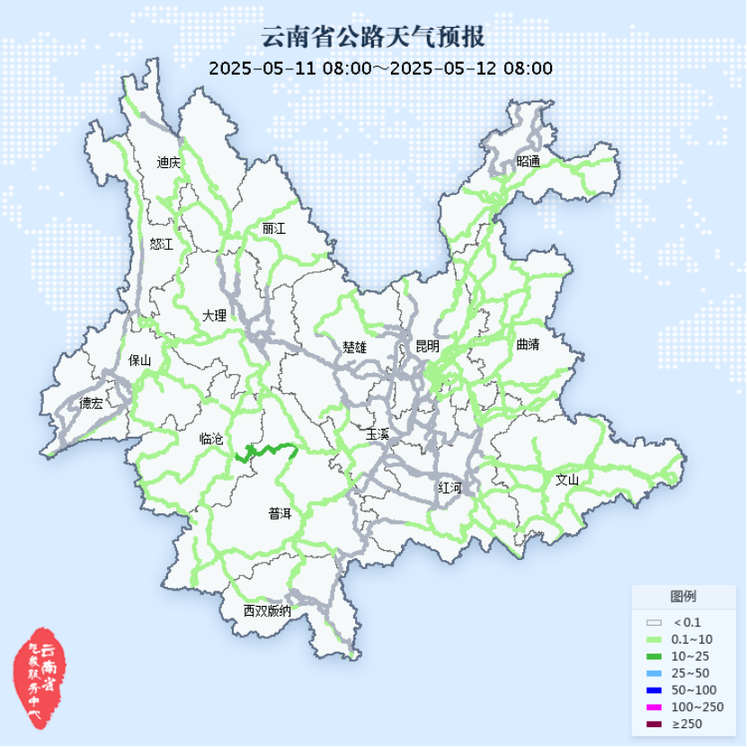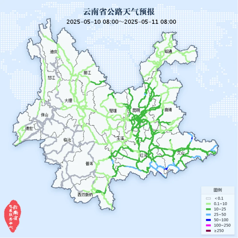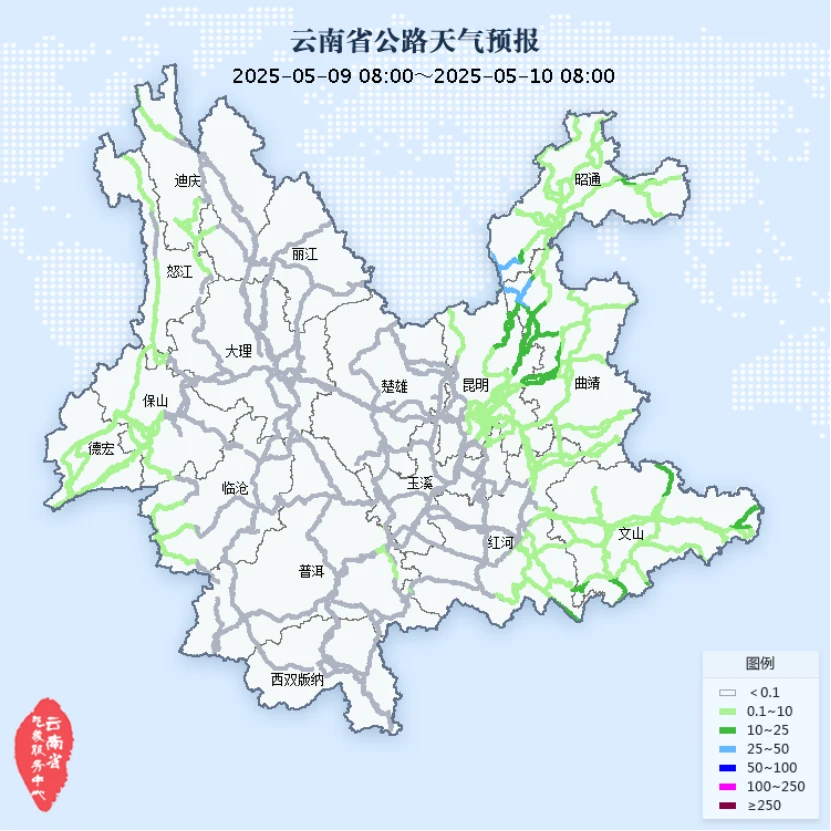 云南省气象台5月8日16时发布重要天气预报:受冷空气和辐合气流共同影响,预计5月9日至5月11日,我省将自东向西出现一次降水降温天气过程。文山州、红河州、普洱市东部有中到大雨局部暴雨、大暴雨,昆明市、昭通市、曲靖市、楚雄州东部、玉溪市、普洱市中西部、西双版纳州、临沧市、丽江市东部有小到中雨局部大雨,上述地区还将出现雷电、小时雨量大于20毫米的短时强降水,局部地区有8级以上雷暴大风或冰雹等强对流天气。过程累计雨量20~40毫米,局部地区50~70毫米,最大可达100毫米。伴随降水,我省大部最高气温将下降4~6℃,局部地区降幅达8~10℃。G80文山段、G85曲靖段、G248曲靖段、G352昭通段、G227普洱段、G219红河段、G8011红河段、G219文山段、G246文山段、G248文山段等路段将自东向西先后受到较强降雨天气影响。请公众出行注意保暖和行车安全。