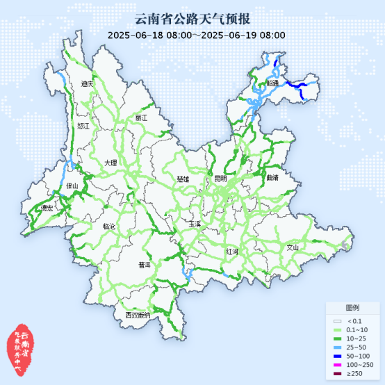 云南省气象台6月17日17时发布重要气象信息报告:受高空槽、低涡切变、地面冷锋和西南季风共同影响,6月18日夜间至22日,我省自东北向西南将有持续性大到暴雨局部大暴雨天气过程。昭通市、曲靖市、昆明市、玉溪市、楚雄州、文山州、红河州、普洱市、西双版纳州东部、临沧市、德宏州、保山市、大理州、丽江市、怒江州有大到暴雨局部大暴雨,过程累计雨量80~150毫米,局部250~300毫米,最大小时雨量60~80毫米。本次过程期间,一是加强暴雨灾害防御。全省大部地区暴雨灾害风险高,需加强防范强降雨引发的山洪、地质灾害、中小河流洪水、城市暴雨积涝。二是防范强对流天气的不利影响。我省东部、中南部和西部边缘地区有雷暴、短时强降水,部分地区可能出现冰雹、大风等强对流天气,需注意防范其不利影响。G352镇雄-威信段、G246镇雄段、G85水富段、S305会泽段、G56麒麟区-沾益段、G60麒麟区-沾益段、G85寻甸-会泽段、G213寻甸-会泽段、G248巧家-东川段、G352威信段、G356鲁甸-昭阳段、G56昆明-安宁段、G56楚雄-大理段、G56保山-龙陵段、G320南华段、G323新平-峨山段、G8511新平段、G56大理下关段、G5611大理-海东段、G5612巍山-南涧段、G214南涧-云县段、G5615云县-凤庆段、G556梁河-盈江段、G56龙陵-芒市段等路段将先后受到暴雨天气影响。请公众出行注意行车安全。
