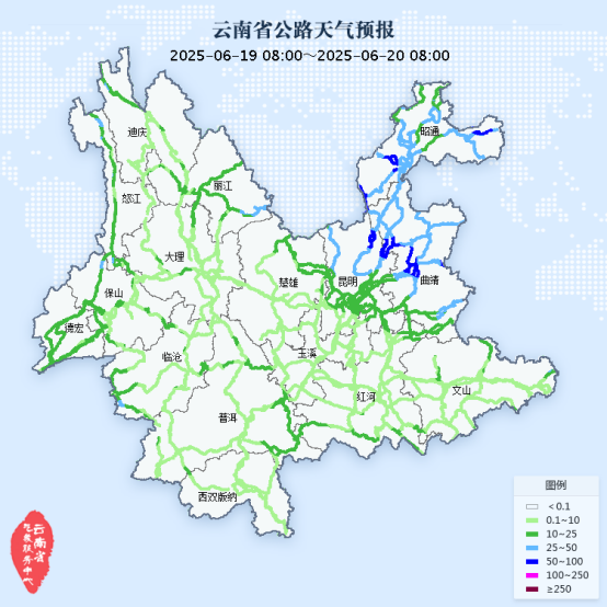 6月19日08时至20日08时受大雨影响的路段为:G85寻甸-水富段、G56马龙-宣威段、G60马龙-富源段、G78师宗-富源段、S91陆良-麒麟段;G213寻甸-永善段、G245禄劝段、G246镇雄段、G247昭阳区-盐津段、G248陆良-麒麟、寻甸-巧家段、G320马龙-富源段、G324师宗-罗平段、G326沾益-会泽段、G352宜良-威信段。G4216华坪段;G213腾冲段、G219沧源段、G219贡山段、G357泸水-云龙段、G358华坪段。