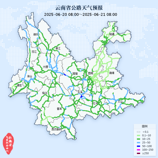 6月20日08时至21日08时受暴雨影响的路段为:G320南华段、G323新平-峨山段、G8511新平段。