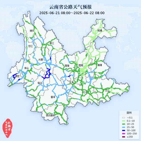 6月21日08时至22日08时受暴雨影响的路段为:G5612巍山-南涧段、G214南涧-云县段、G5615云县-凤庆段、G556梁河-盈江段、G56龙陵-芒市段。