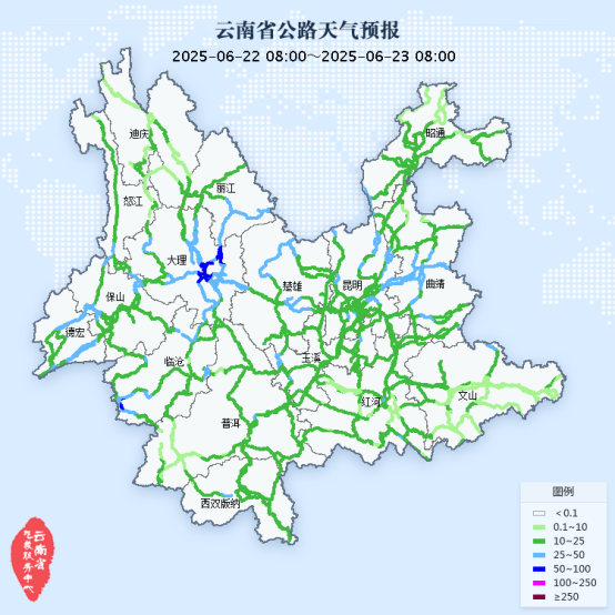 6月22日08时至23日08时受大雨影响的路段为:G56祥云-永平段、G56龙陵-芒市段、G219沧源-镇康段、G5611大理-洱源段、G348大理-丽江段、G4216攀枝花-永胜段、G5元谋-攀枝花段、G60嵩明-富源段、G85寻甸段。