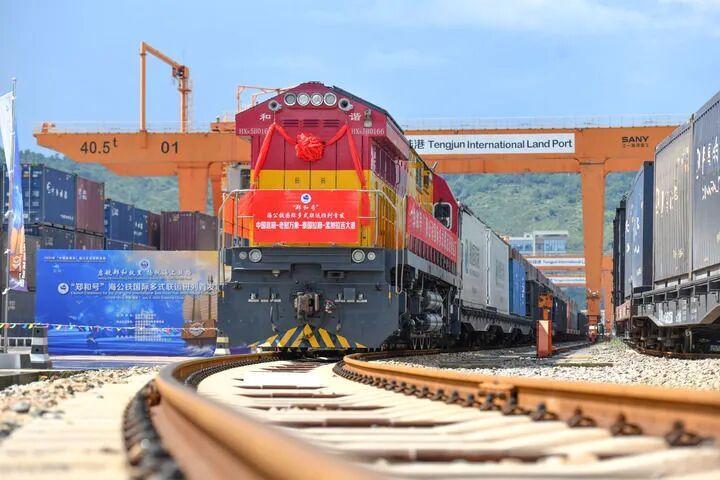 8月28日下午,悠长的鸣笛声中,一列满载11柜新鲜云南特色果蔬的“郑和号”海公铁国际多式联运班列,从昆明市腾俊国际陆港出发,朝着老挝万象驶去。
