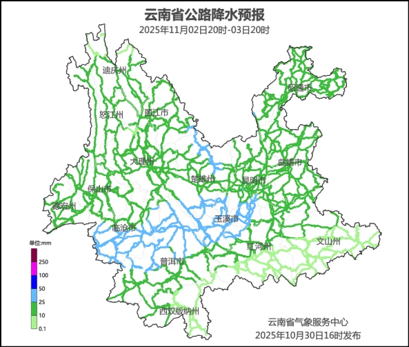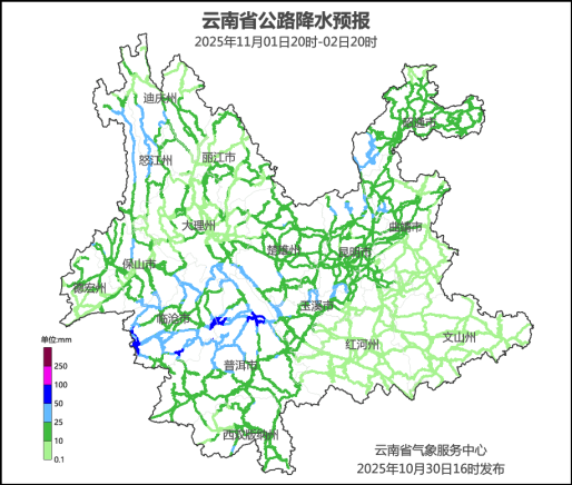 11月1日20时至11月2日20时受大雨影响的路段为:S57施甸县—永德县段、G7611巧家县段、S33晋宁区段、G8511晋宁区段、G5601晋宁区段、S94临翔区段、S51临翔区—双江县、S50临翔区段、S23巧家县段、G8012楚雄市—峨山县段、S41景东县—南涧县段、G5615昌宁县—墨江县段、S20会泽县段、S90沧源县段、G85会泽县段、G219贡山县—泸水县段、S237维西县—兰坪县段、G215维西县段。